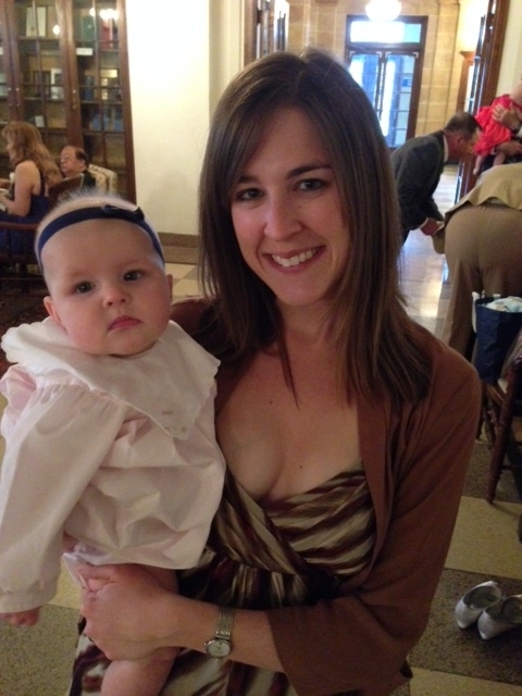 We drove to Madison this past weekend for a wedding. Eric's old co-worker, Josh, married Raechel in downtown Madison, Wisconsin. The drive usually takes us about 4 1/2 hours but things are different with a 6 month old. Maeve still isn't a good bottle taker so when she refused a bottle before we left home at 8:30am on Saturday morning (note that the wedding started at 2pm) we knew we were in for trouble. Maeve slept for a few hours and then refused her bottle the rest of that morning. We tried plugging in our new bottle warmer in Eric's truck but it wouldn't work because of the heating element in it, so we resorted back to what we usually do - warm the bottle in a glass of hot water. No luck still! With 30 minutes left to go we were starting to become concerned because Maeve hadn't eaten in 6 1/2 hours. We stopped at a rest stop and finally had the bright idea to try the bottle warmer. It worked! So our 4 1/2 hr road trip took about 6 hours. We didn't make it in time to go to the ceremony but were able to check into the hotel and go to cocktail hour. It helped that our hotel was a 2 minute walk from the reception facility. Maeve was great during the cocktail hour and dinner and then Kate went back to the hotel room where she held Maeve most of the night (oh, did I mention that she was getting an ear infection and didn't want to sleep in her crib - good thing we brought the rock n play as a back-up). She finally went down and Kate fell asleep at 9pm. Eric came home later after enjoying the reception with his former co-workers.