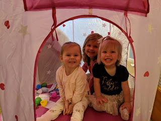 Cecilia enjoyed playing with her sister and cousin, Payton. They enjoyed getting into the new gifts like kinetic sand, new luggage, stuffed pillows and animals, paint sticks and clothes. Thank you all for your generosity! She also loved the tent that her Mom and Dad got her and Grandpa Ed set up.